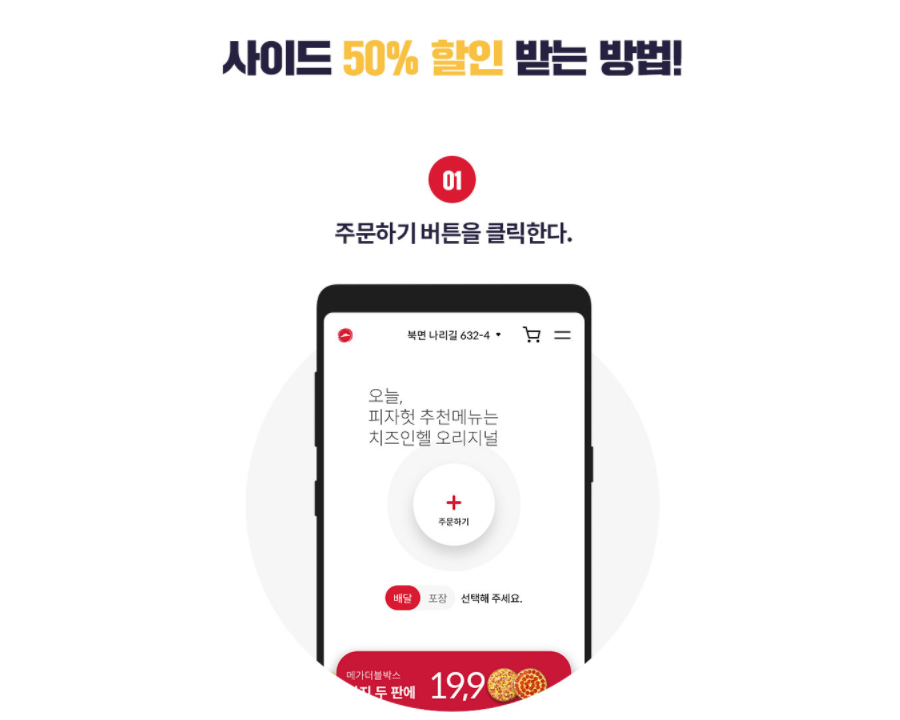 사이드메뉴를 50%할인받으시려면 피자헛 앱에서 주문하기 버튼을 클릭하시고 피자를 선택하신후에 하단으로 스크롤해주셔서 50%할인하고 있는 사이드메뉴를 선택하시고 장바구니로 이동하시면 됩니다.