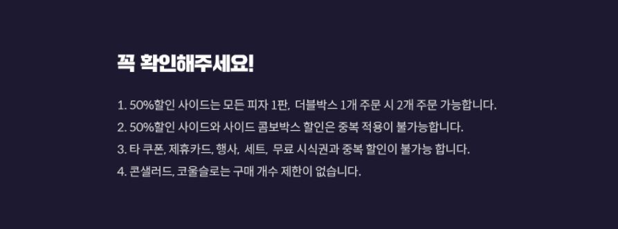 단 주의해주셔야할 것은 50% 할인된 사이드 메뉴는 모든 피자1판, 더블박스 1개 주문시 사이드메뉴 2개 주문 가능합니다. 사이드 메뉴 50%할인과 콤보박스 할인은 중복으로 적용되지 않습니다. 타 쿠폰 및 제휴카드 또는 할인행사와 같은 다른 이벤트랑은 중복할인이 불가능합니다. 콘샐러드 와 코울슬로는 구매개수 제한이 없습니다.