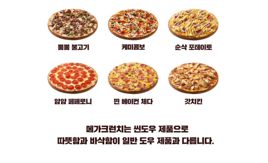 메가 크런치 씬도우 제품의 피자 종류는 하와이안 & 페퍼로니, 갓치킨 & 포테이토, 하와이안 플렉스, 뿜뿜 불고기, 케미콤보, 순삭포테이토, 얌얌 페퍼로니, 찐 베이컨 체다, 갓치킨이 있습니다.