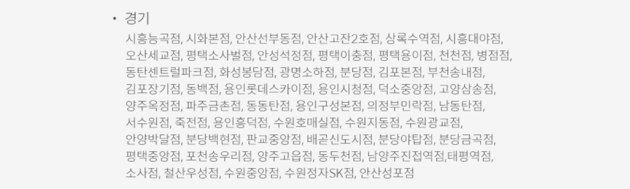 시흥능곡점, 시화본점, 안산선부동점, 안산고잔2호점, 상록수역점, 시흥대야점, 오산세교점, 평택소사벌점, 안성석정점, 평택이충점, 평택용이점, 천천점, 병점점, 동탄센트롤파크점, 화성봉담점, 광명소하점, 분당점, 김포본점, 부천송내점, 김포장기점, 동백점, 용인롯데스카이점, 용인시청점, 덕소중암점, 고양삼송점, 양주옥정점, 파주금촌점, 동동탄점, 용인구성본점, 의정부민락점, 남동탄점, 서수원점, 죽전점, 용인흥덕점, 수원호매실점, 수원지동점, 수원광교점, 안양박달점, 분당백현점, 판교중앙점, 배곧신도시점, 분당양탑점, 분당금곡점, 평택중앙점, 포천송우리점, 양주고읍점, 동두천점, 남양주진접역점, 태평역점, 소사점, 철산우성점, 수원중앙점, 수원정자sk점, 안산성포점