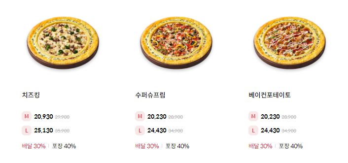치즈킹 피자는 L사이즈는 25130원, M사이즈는 20930원입니다. 슈퍼슈프림 피자의 경우 L사이즈는 24430원이고 M사이즈는 20230원입니다. 베이컨포테이토 피자의 경우 L사이즈는 24430원이고 M사이즈는 20230원입니다.