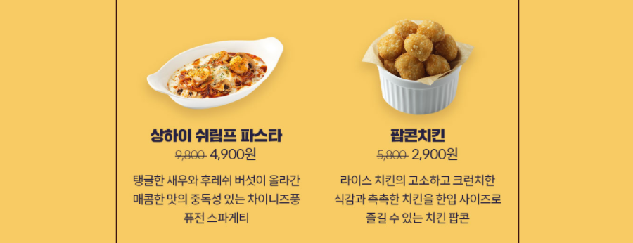 상하이 쉬림프 파스타를 4900원에 즐기실 수 있고, 팝콘치킨을 50%할인된 가격인 2900원에 즐기실 수 있습니다.
