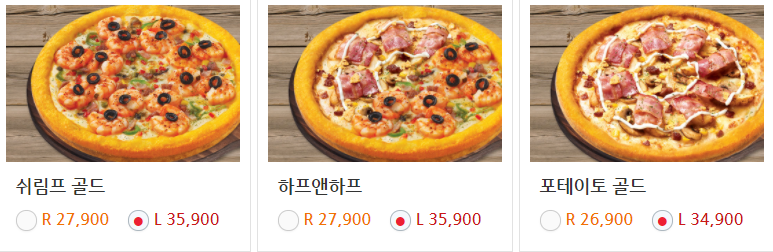 쉬림프 골드는 R사이즈가 27900원이고 L사이즈가 35900원입니다. 하프앤하프는 R사이즈가 27900원이고 L사이즈가 35900원입니다. 포테이토 골드는 R사이즈가 26900원이고 L사이즈가 34900원입니다.