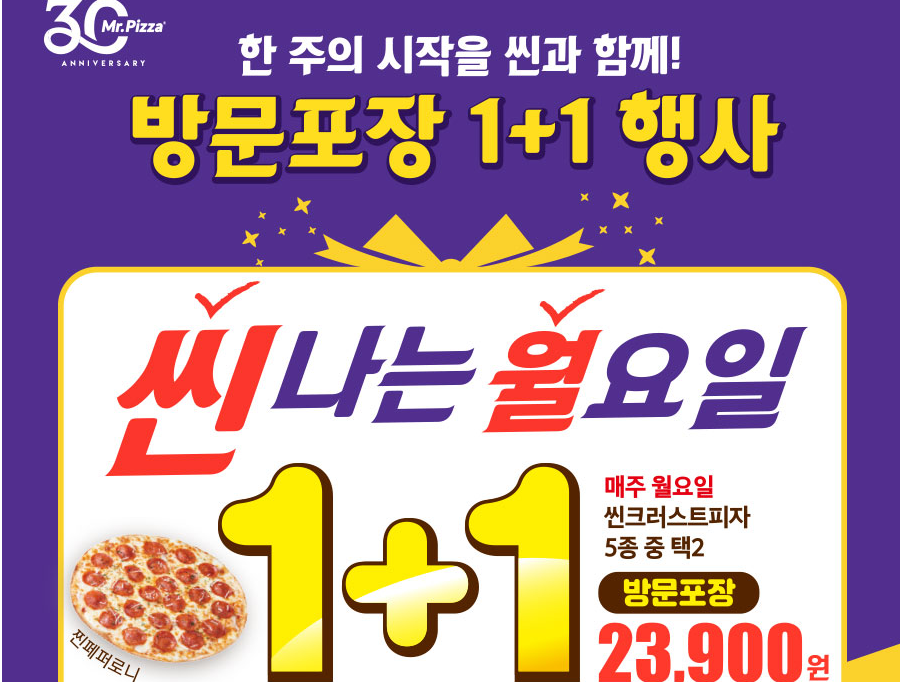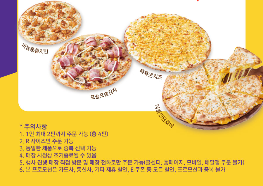 매주 일요일마다 씬크러스트피자 5종중에서 2개를 택하여 1+1 방문포장 할인을 받으실 수 있습니다. 가격은 2판에 23900원입니다. 씬크러스트 피자의 종류에는 찐페퍼로니, 마늘통통치킨, 포슬포슬감자, 톡톡콘치즈, 더블씬단호박 피자가 있습니다. 주의사항으로 1인 최대 2판까지 주문가능합니다.(총4판), R사이즈만 주문가능하고 동일한 제품으로 중복선택가능합니다. 매장마다 사정에따라 조기 종료할 수 있으며, 행사를 진행하는 매장에 직접방문하거나 전화로 주문을 하실 수 있습니다. 단 홈페이지 모바일 또는 배달앱에서는 주문 할 수 없습니다. 다른 제휴 할인행사와는 중복해서 할인받으실 수 없습니다.