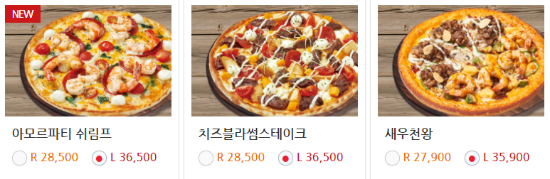 아모르파티 쉬림프는 R사이즈가 28500원이고 L사이즈가 36500원입니다. 치즈블라썸스테이크는 R사이즈가 28500원이고 L사이즈가 36500원입니다. 새우천왕은 R사이즈가 27900원이고 L사이즈가 35900원입니다.