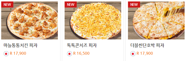 마늘통통치킨 피자는 R사이즈가 17900원입니다. 톡톡콘치즈 피자는 R사이즈가 16500원입니다. 더블씬단호박 피자는 R사이즈가 17900원입니다.