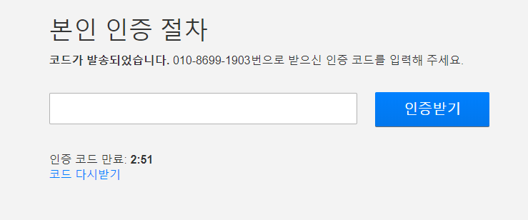 만약 3분안에 입력하지 못했을때는 밑에있는 "코드 다시받기"버튼을 누르시면 재전송해줍니다.